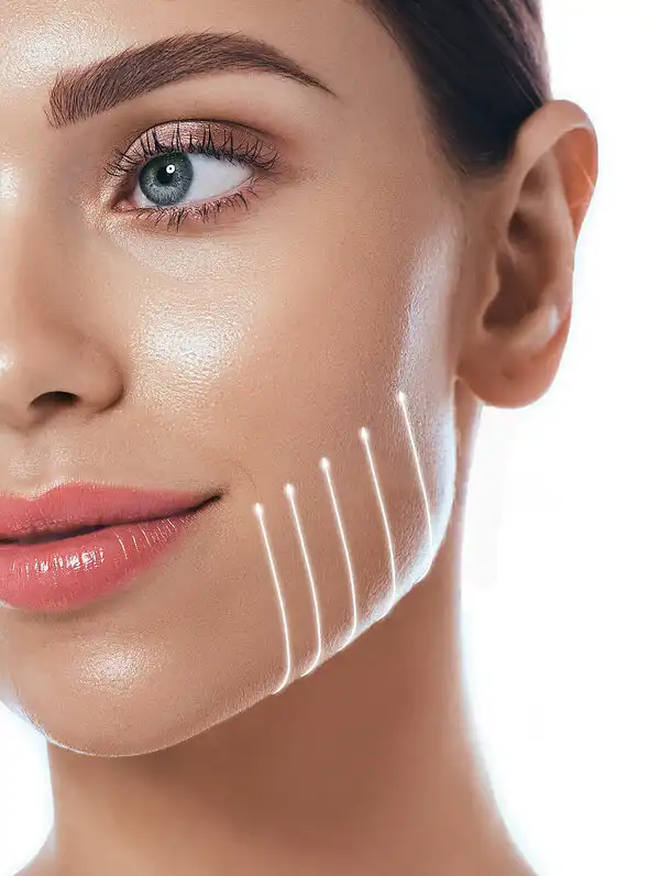 The procedure is a minimally invasive treatment that can be done in the clinic with topical or local anaesthesia. The special medical threads are inserted under the skin and tighten and lift the sagging area by pulling up the structure. The inserted threads work as anchors to hold the tissue.